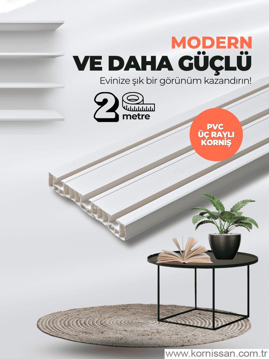 Ekonomik 2 Metre Üç Raylı Dayanıklı Birinci Sınıf PVC Korniş Rayı, tül, fon ve blackout gibi farklı perdeleri bir arada kullanmak isteyenler için pratik ve ekonomik bir çözümdür. Yüksek kaliteli PVC’den üretilmiş olup, uzun yıllar formunu korur. Orta boy pencereler, kapı üstleri, balkonlar ve ofisler için uygundur. Kolayca temizlenebilir ve istenirse kısaltılarak farklı alanlara uyarlanabilir. Montaj seti dahil değildir; aksesuarlar ihtiyaca göre ayrıca temin edilebilir.