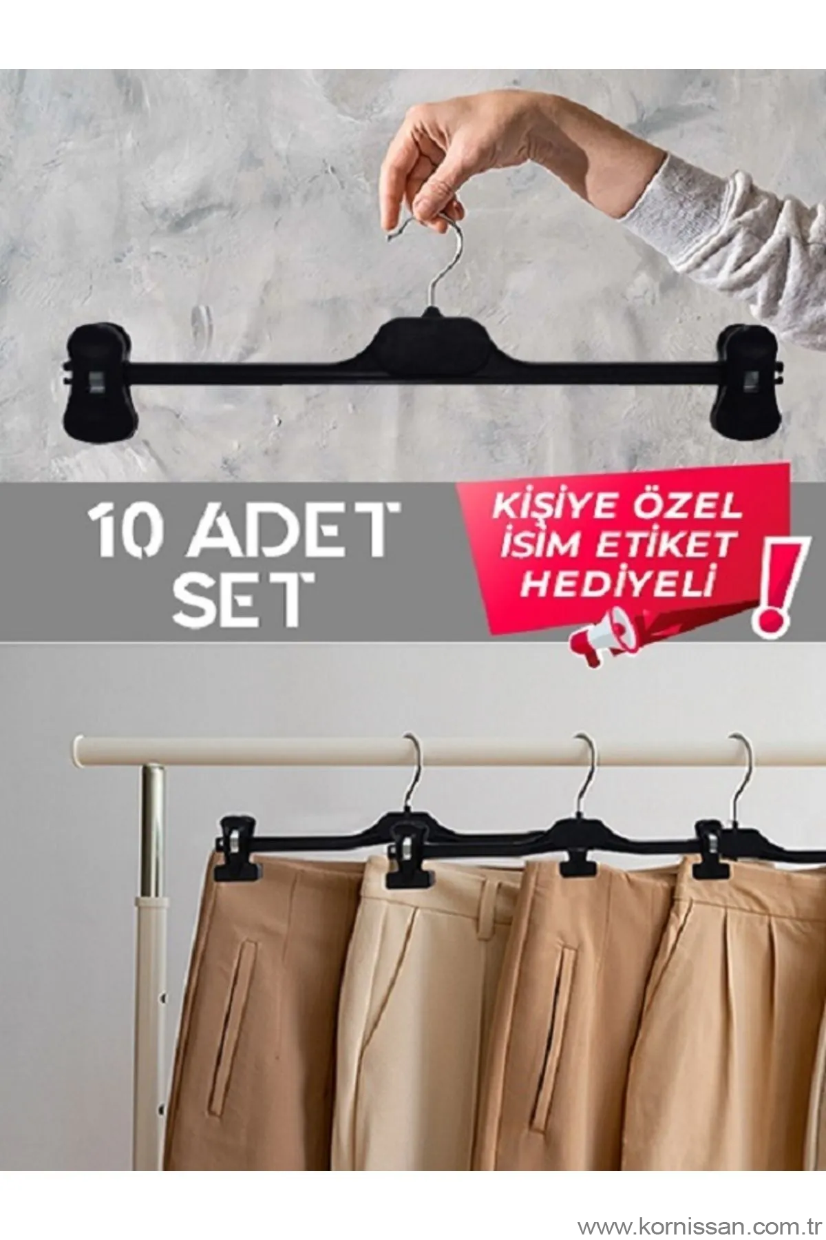 Dolap düzenlemesi artık çok daha kolay ve düzenli! Bu 10'lu döner başlıklı mandallı askı seti, pantolon, etek ve diğer kıyafetleriniz için mükemmel bir çözüm sunar. Her bir askı, kullanımı kolaylaştıran döner başlıklı mandallarla donatılmıştır ve kıyafetlerinizi iz bırakmadan asmanızı sağlar. Kaliteli malzemelerden üretilen bu siyah askı seti, uzun ömürlüdür ve dolabınızı düzenli tutmanıza yardımcı olur. Ürün ölçüsü 38 cm'dir ve standart dolaplar için uygundur. Ayrıca, her bir askıya kişiye özel isim etiketi de hediye edilir, böylece kişisel dokunuşlarınızı ekleyebilirsiniz. Mükemmel tasarımı sayesinde dolabınızı düzenlemenize yardımcı olan bu askı seti, fonksiyonel tasarımıyla da dikkat çeker. Kenarlarında bulunan mini aksesuar kancaları sayesinde ekstra düzenleme imkanı sunar, böylece dolabınız daha da organize ve kullanışlı hale gelir. Kornişsan askı seti, dolap içi düzenleyici, askılık, pantolon askısı, elbise askısı, etek askısı gibi birçok farklı amaç için kullanılabilir